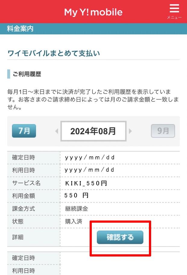 7.表示された現在登録中のサービス一覧の中からサービス名「KIKI」の詳細「確認する」をタップ