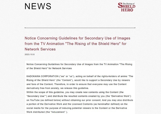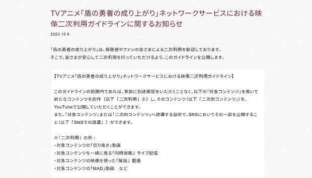 このガイドラインの範囲内であれば、事前に別途確認をいただくことなく、YouTubeチャンネル「KADOKAWAanime」で公開された「盾の勇者の成り上がり」の以下再生リスト(https://www.youtube.com/playlist?list=PL3ongWuaWwZOKlEI6LbgGMENXTZvPYJUD)内のコンテンツ及び、公式のキービジュアル・場面カット・ロゴ(https://drive.google.com/drive/folders/1IMRnv1J2AZIFV3rOQmrf0JnM3QfkfysY)を用いて新たなコンテンツを創作し、そのコンテンツを、YouTubeで公開していただくことができます。