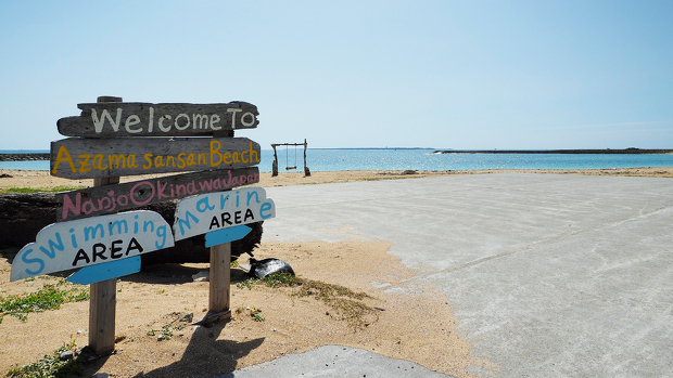 「神の島」と言われる久高島を臨む、あざまさんさんビーチ。青柳さんを交えて記念撮影を予定