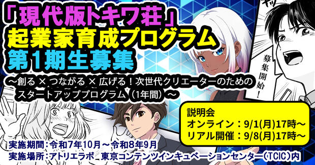 このたび、プログラム第1期生の募集を開始されました。アニメや漫画産業において、デジタル技術を活用したオリジナルIPを創出し、グローバル展開をめざす方や、新たなビジネスモデルで起業をめざすクリエーターのご応募をお待ちしております。