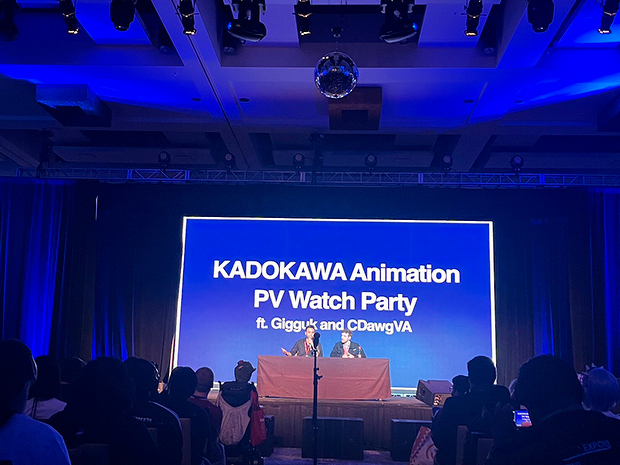 7月1日から4日にかけて、アメリカ・ロサンゼルスで開催されているAnime Expo。複数ある会場の一つ・JW Marriott Los Angeles LA LIVEのDiamond Hallで2日夜に開催されたのが、KADOKAWAが手掛けるアニメ作品のPV上映会です。MCとして北米で人気を集めるYouTuberのGiggukとCDawgVAが登壇し、コメントを挟みながら様々な作品の紹介が行われました。この記事では、その模様を現地よりレポートします。