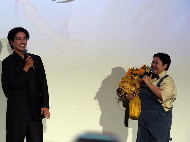 その後、ステージ上ではダブルの“サプライズ”を実施。山田監督にはメインキャスト3人から、彼女が好きだという淡い色の花をまとめた花束、初対面時から溜めてきた写真のボード、そして涼川さんからの手紙が贈られます。涼川さんが涙ながらに「何者でもなかった私を見つけてくれてありがとうございました」と感謝のメッセージを読み上げると、山田監督は恐縮しながら「滅茶苦茶うれしい。みなさん集まってくれたのに……私ばかり幸せで恐縮です」とはにかみます。さらに9月2日に誕生日を迎えるやす子さんにも花束がプレゼントされると、彼女は「キアヌ・リーブスと同じ誕生日です」と明かしながら「恐れ多いです。『きみの色』がもっともっといろんなところで、いろんな人に愛される作品になれますように!」とアピールしました。