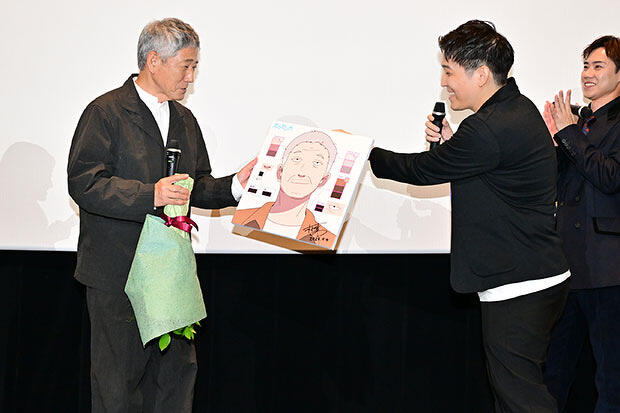 ここで試写会当日に74歳の誕生日を迎えた小林さんに、サプライズで花束と木下監督がこの日のために描き下ろしたアニメの色設定画仕立ての小林さんの似顔絵が贈られました。