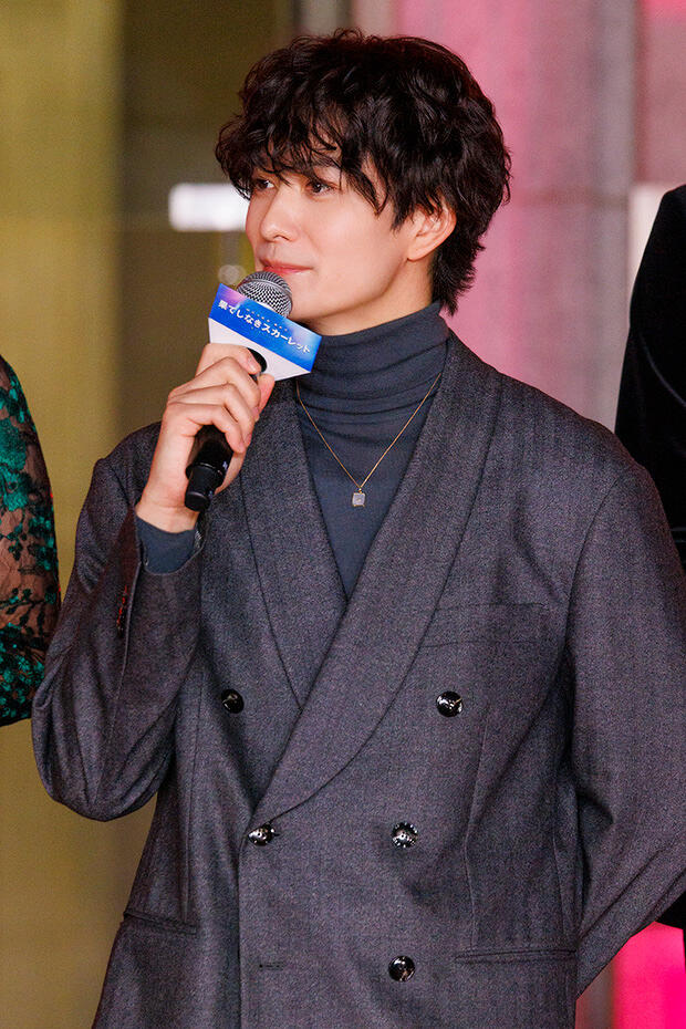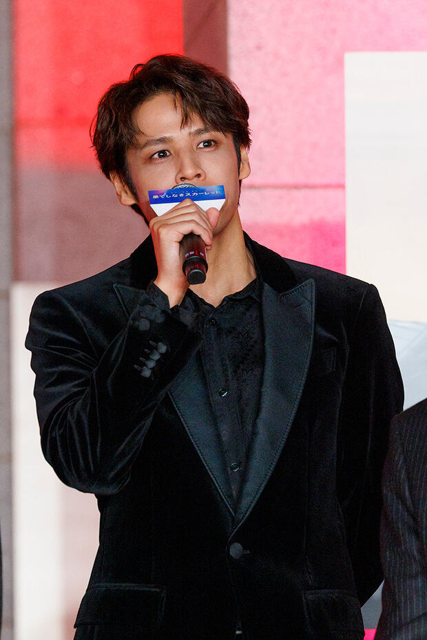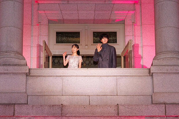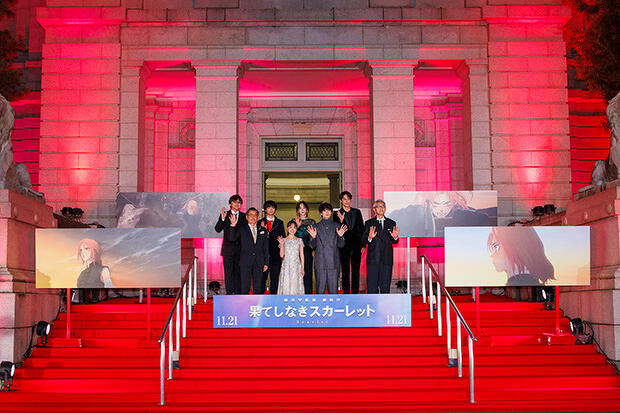 2025年11月21日(金)に公開を控える細田守監督最新作「果てしなきスカーレット」ジャパンプレミアが、11月5日、東京国立博物館にて開催されました。東京国立博物館は19年前に公開された「時をかける少女」にも描かれている場所。最初に登場したのは、とある国の王女スカーレットを演じた芦田愛菜さんと、《死者の国》で彼女と出会う看護師の聖を演じた岡田将生さんです。夜の闇にスカーレット色にライトアップされた表慶館が浮かびあがると、バルコニーからエレガントな白のドレスの芦田さん、シックなスーツに身を包んだ岡田さんが姿を現して、にこやかに手を振り、スカーレット色のペンライトを振る観客たちを沸かせました。