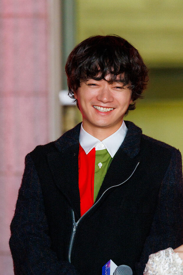 正面入り口に移った2人に続いて登壇したのは、ギルデンスターン役の染谷将太さん、墓掘り人役の宮野真守さん、ヴォルティマンド役の吉田鋼太郎さん、ガートルード役の斉藤由貴さん、コーネリウス役の松重豊さん、そして、細田守監督。みなさん、ドレッシーな衣装をまとっていて表慶館をバックにしたシチュエーションにぴったりです。