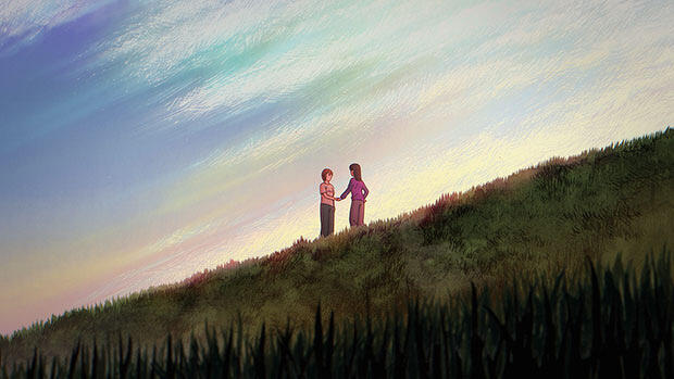 寺澤 藤本先生の作品自体に、ああいう線が入る影みたいな表現がたくさんあると思うんですが、加えて自分が、デ・キリコがやるような、影によって世界が分割されている、どこか壊れた感じの絵がもともと好きなんです。それを今回、やってみようと思いました。あの表現は背景で影の形を全部決め込んだうえに、セル(人物)でも合わせて影を描かないといけないので、TVシリーズでやるのはかなり難しい。今回は短編なのでやり切れるかなと。後は、小ネタみたいな話になりますが、藤本先生のほかの作品を全部読んで、そこから全カットの構図を拾いました。藤本先生っぽい、あの何とも言えない空気感のあるレイアウト感をどうやって出すかを考えたら、そのやり方が最適かなと。ほかにTシャツの文字も「ルックバック」からの引用ですし、トシヒデが溶けていく演出も「チェンソーマン」の原作からもってきたオマージュです。手の表現もそう。藤本先生がフレームを手が割ったり、マンガのフレームの外から手が出てくるみたいな表現をよくやられるのを取り入れてみました。