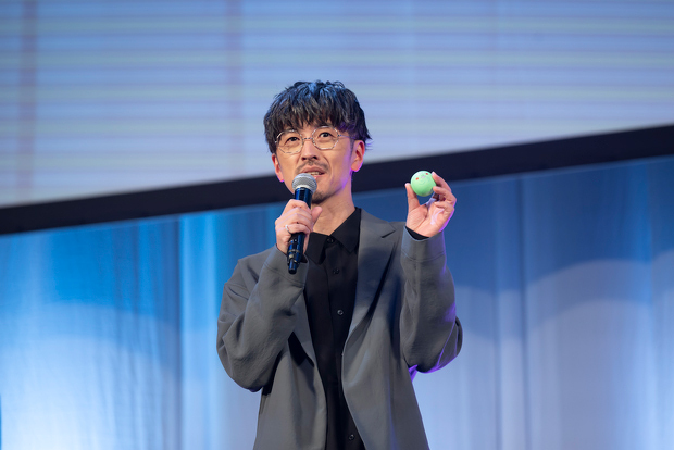 入場者にはエクボを模した「エクボを鳴らして応援!エクボ型ボール」が渡され、ゴムボール特有のきゅいきゅいとした音が鳴り響く中、イベントがスタート。松澤千晶さんが司会としてステージに現れると、モブ役・伊藤節生さんがスクリーンに登場しました。エクボ型ボールを出演陣に渡していくという一幕で、芹沢役・星野貴紀さん、霊幻新隆役・櫻井孝宏さん、ツボミ役・佐武宇綺さん、花沢輝気役・松岡禎丞さん、影山律役・入野自由さん、エクボ役・大塚明夫さん、郷田武蔵役・関俊彦さんをお迎えに(登場順)。マグカップの持ち手が取れてしまった(星野さん)や、バリカンで落ち武者ヘアーにしようとする(松岡さん)、など作品の内容にちなんだボケを挟みつつ、キャストが勢揃いしました。