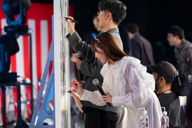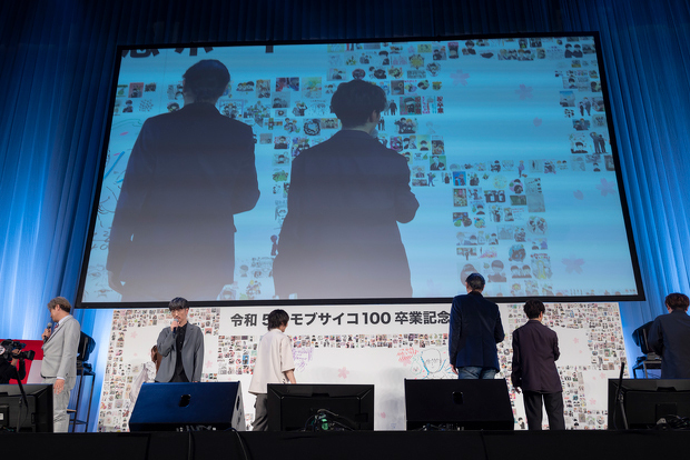 次のコーナーは「モブサイコの思い出で満たそう 卒業記念ボード」! ファンの皆さんから送られたイラストのほか、キャラクターデザインを務めた亀田祥倫さんやアイキャッチを担当した賢者さんのイラスト、立川監督、蓮井監督のサインなどが描かれたボードがステージ上に登場。場面カットやキャラクターのシールが用意され、キャスト陣が思い思いに装飾をしていくコーナーです。