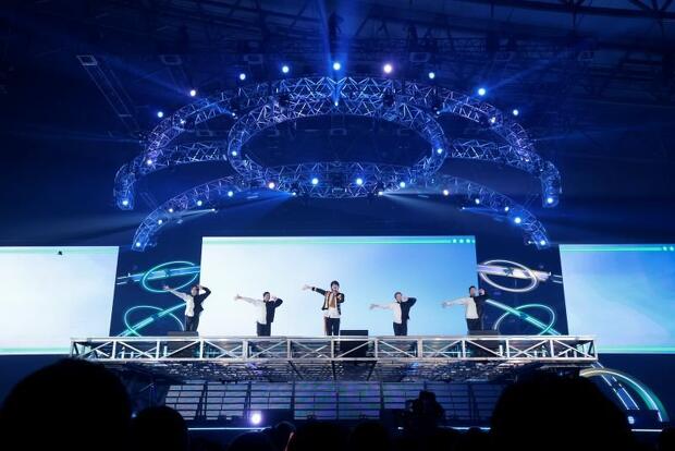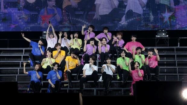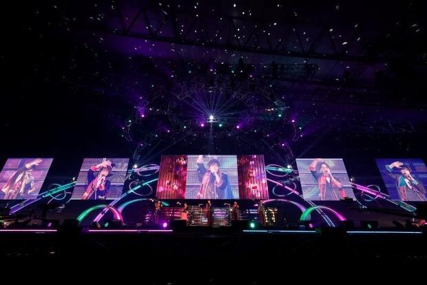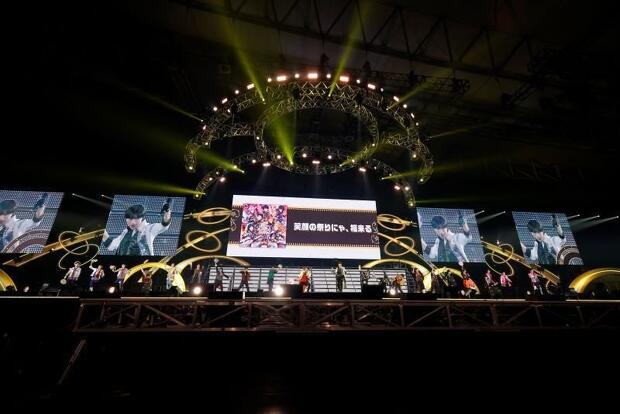 一転し、Jupiterが脚を組んで階段にもたれて座れば、そこは〝大人〟がひととき夢を見る世界。人差し指を唇に当て「BRIGHTEST AWAKING」で、夜の帳を下ろします。黒字にゴールドが効いた9th STAGE衣装「ミラクルインビテーション」がネオンなライティングに映え、もふもふえんの「からふる・とれじゃ~わ~るど!」にも不思議と秘密の夜遊び感が漂っていました。そしてさらに夜は更け、千手観音ダンスも迫力のF-LAGS「FANTASTIC DISCOTHEQUE」。ウィンクの乱れ打ちはナイトクルーズの夜空に瞬く星の数々のよう。そんな大人の時間を締めくくるのは、DRAMATIC STARSとS.E.Mが3Dアイドルライブ「F@NTASTIC COMBINATION LIVE」で披露した合同曲「Dramatic Anthem」!