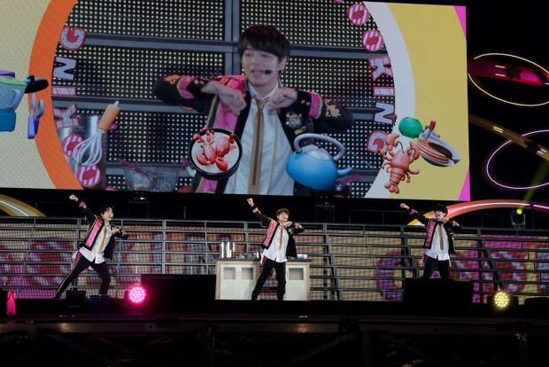Café Paradeがデリバリースタイルでお届けするのは「Heartmade Cookies」。トロッコにはしっかりとサタンも鎮座して〝6人〟のフルメンバーでつくり上げるおもてなしに心が温まります。そしてなんとその頃メインステージに誂えられたキッチンにはS.E.Mがスタンバイ! 新境地のお料理ソング「Life’s Side Menu!」で「挑戦って難しくないんだよ」という不変のテーマを歌い上げます。あまりに3人らしい料理風景で、榎木淳弥さんが調理器具をすべらしてしまったのが振りではなくアクシデントだったとは……。流し台に両手を置いて体を左右に伸ばす新型のたけのこダンス(!?)も強烈なインパクトを残しました。