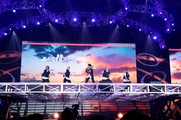 すっかりリゾート気分の会場にディスコティックなイントロが聞こえてくればCafé Paradeが「Dear you, Cheers!!」で、ゾンビダンスを交えて海の家ならぬ肝試しカフェを開店。MCでは、5人揃えばさすがのにぎやかさで、一緒に指でハートをつくる約束をしていた天﨑滉平さんが裏切って親指を立ててグッドの型にしたことを告発した狩野翔さんでしたが「でも、よく見るとカップの形じゃない?」とポジティブに変換したくだりも笑いを誘いました。階段に向かい合って座り、互いの瞳に揺れるさざなみを優しく見つめ合いながら歌われるAltessimo「Precious ordinary days」。日常を歌う2人のハーモニーは優しく頬をくすぐる癒やしの海風のよう。そこへトロッコに乗り颯爽と現われたS.E.Mは「Eterniteen Age!!!」で、大人だからこそ羽目を外したい夏の楽しみ方をレクチャー。いつの間にかメインステージではF-LAGSが凛々しくポーズを決めており「Bitter Sweetアドレセンス」で、清涼感の権化たる歌声を響かせます。ラブレターを書いて渡そうとする振りもかわいらしく、MCでは書き方講座が行なわれました。
