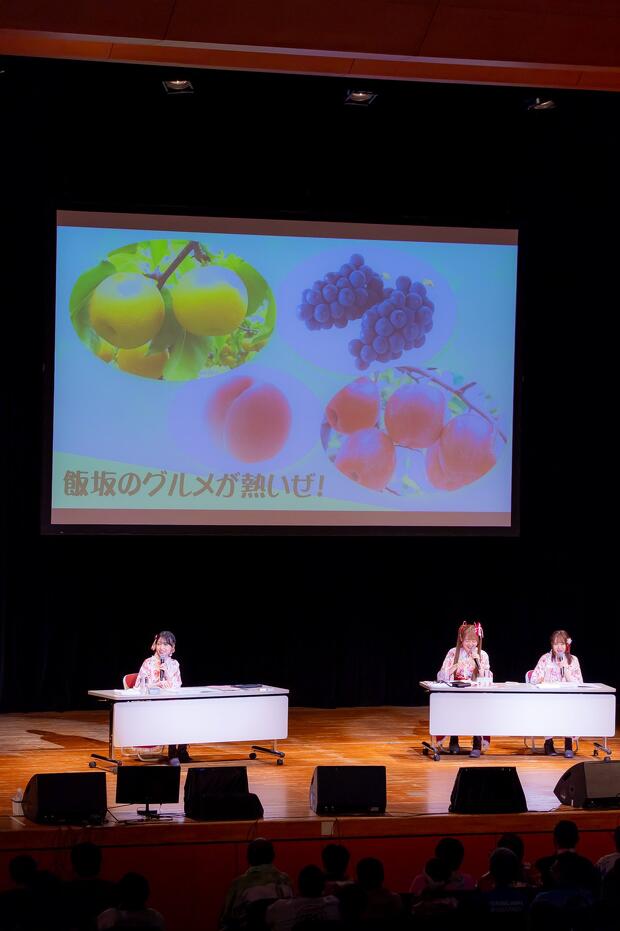 第1部の本編は「飯坂温泉 熱いぜ!!プレゼン」というトークコーナーからスタート。温泉の泉質や効能、イベント、真尋ちゃん熱などが吉岡さんの解説を交えて紹介されるなか、「グルメが熱い」という話題ではさまざまなフルーツの産地である福島らしくシャインマスカットやラ・フランスがステージに登場。その試食時に張り切っていたのが高木さん。ラ・フランスを食べると「すごく瑞々しい。もっちりしているくらい実が詰まっている」としっかり食レポし、シャインマスカットはおかわりをしたうえに完食してみせます。