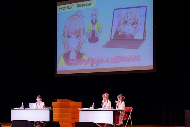 続いての「たくさん答えて!真尋ちゃんAI」は、この日会場にも設置されていたリアルタイムで会話ができる“真尋ちゃんAI”を使ったクイズコーナーで、質問に対して返ってくるであろう答えを3人が予想するというルールです。ここでは村上さんが活躍し、「マイブームを教えて!」「飯坂でお土産を買うなら何がオススメですか?」といった質問への真尋ちゃんAIの答えにニアミスを続けます。しかし最後の「『温泉むすめ』で一番の友だちは誰ですか?」という質問には、吉岡さんが「なぜか慕ってくれている東山季利花」とドンピシャの正解をして貫禄を見せます。