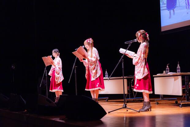トークパート後はスペシャル朗読劇「激アツ!人生のルーレット」へ。温泉むすめの3人が人生ゲーム風のルーレットをするという内容でしたが、小野川小町の妄想と暴走を中心に会場は終始笑いに包まれます。その後は2025年に新潟県・松之山温泉や鳥取県・三朝町で行なわれるイベントが紹介され、さらに新情報として、2024年12月21日(土)のトークイベントや2025年2月5日(水)・6日(木)に開催される「宿フェス2025」への参加がアナウンスされました。