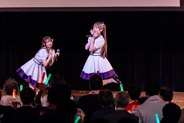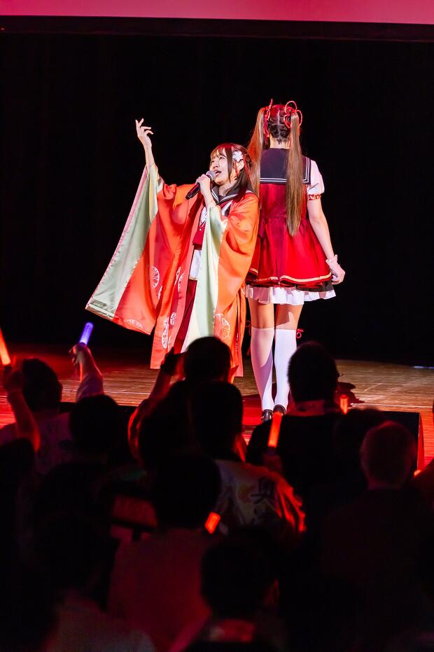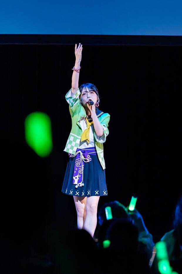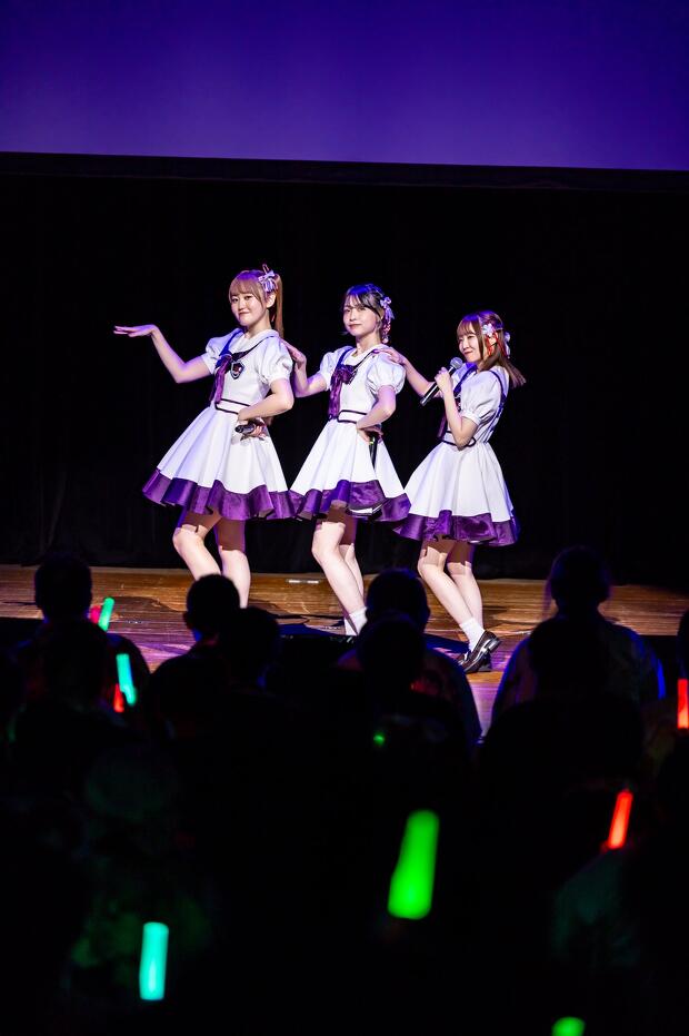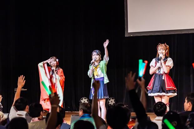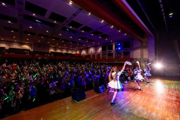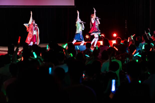 すっかり温まった会場にさらに熱気を呼び込んだのは、制服衣装に着替えた3人の声優による「情熱のパラディソ」。『温泉むすめ』のユニット・AKATSUKIによる楽曲ですが、事前に発表されて話題を呼んでいたように今回はカバーがライブの中心に。続いて7人ユニットのAdharaの「イプシロン進化論」を高木さんと村上さんが、「孤高のピエロ」を吉岡さんが歌唱。吉岡さんは「Adharaの曲は元々大好きだったので『これをライブでやらないのはもったいない』とずっと言っていたけど、まさか自分のやることになるとは」と思い入れたっぷりに語ります。