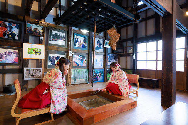 実は松之山温泉は日本一の豪雪地帯と知られる温泉地。この日も天候こそほぼ晴れだったものの道の左右には身長以上の雪の壁がそびえ立ち、降雪の影響が伺える状況でした。そこで石原さんと豊田さんは近くの「湯守処 地炉(じろ)」へ。まずは入口にある熱々の足湯を雪で冷ましながら堪能。身体を温めたあとは古民家を改装したイベントスペースに入り、囲炉裏で「魚やお餅、きりたんぽを焼いたら美味しそう」なんて談笑をしながらひと休みしました。