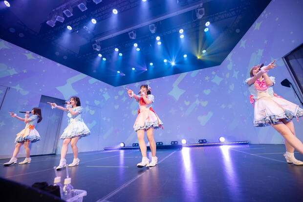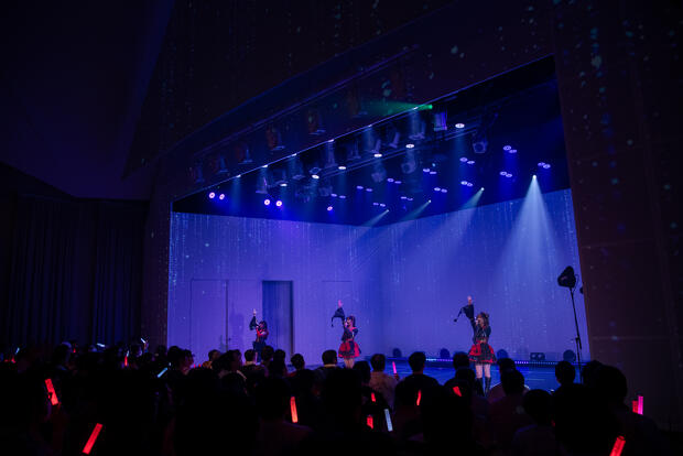 ステージを全体を彩っていた映像演出も初の要素です。これまでの「温泉むすめ」ライブではステージ後方のスクリーンにカメラの映像が映し出されることが多かったですが、飛行船シアターは270度プロジェクションマッピングをすることができる会場の特性を生かし、今回は全面的に映像演出を導入。ステージ後方だけでなくその左右、そして壁面まで「情熱のパラディソ」では炎、「SILENT VOICES」では雪といった具合に楽曲の雰囲気に合った映像が映し出され、観客を楽曲の世界観に没入させる一助となっていました。