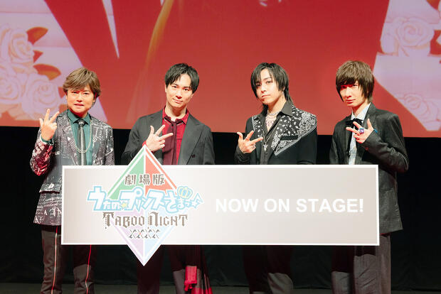 人気ゲームソフトを原作としたアニメ「うたの☆プリンスさまっ♪ マジ LOVE」シリーズの劇場版最新作『劇場版 うたの☆プリンスさまっ♪ TABOO NIGHT XXXX』は、嶺二、蘭丸、藍、カミュの4人からなるQUARTET NIGHTの〝新たなる到達点(ユートピア)〟を全編ライブアニメーションで描く完全オリジナル作品です。その公開スタートを記念した舞台挨拶が、5月11日にパシフィコ横浜 国立大ホールで開催されました。全国の劇場でもライブ・ビューイングが行なわれ、4人のキャスト陣が本編のネタバレを配慮しながらも熱い愛を語った夜公演の模様をお届けします。