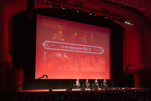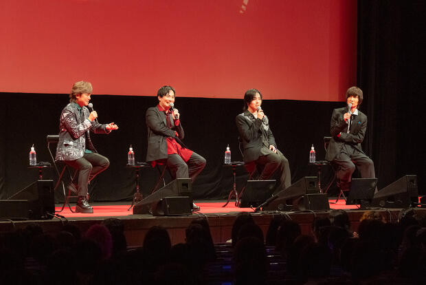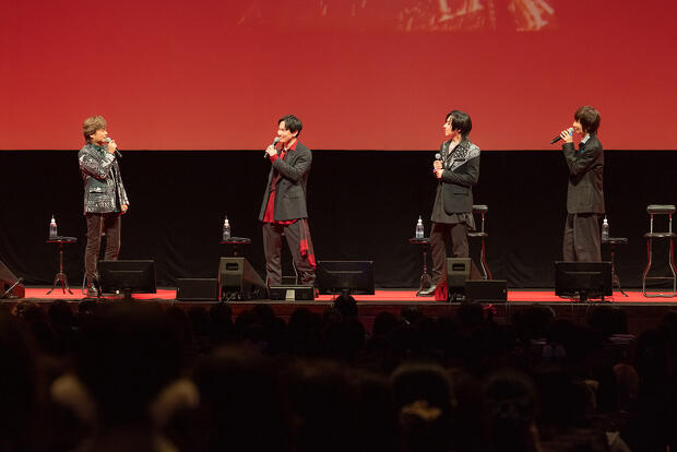 劇場版の公開を待ち望んでいたファンの熱い拍手に迎えられて登壇したのは、寿 嶺二役・森久保祥太郎さん、黒崎蘭丸役・鈴木達央さん、美風 藍役・蒼井翔太さん、カミュ役・前野智昭さんというQUARTET NIGHTのメンバーを演じる4人のキャスト陣。ネタバレが可能だったため、それぞれのソロパフォーマンスに対する具体的な解釈などが語られた昼公演とは異なり、いかに直接的な言及を避けて作品の見どころを伝えるかということで、森久保さんいわく「ポロリしちゃいそうで怖いんです!」という緊張感もありながら夜公演の幕が開けました。