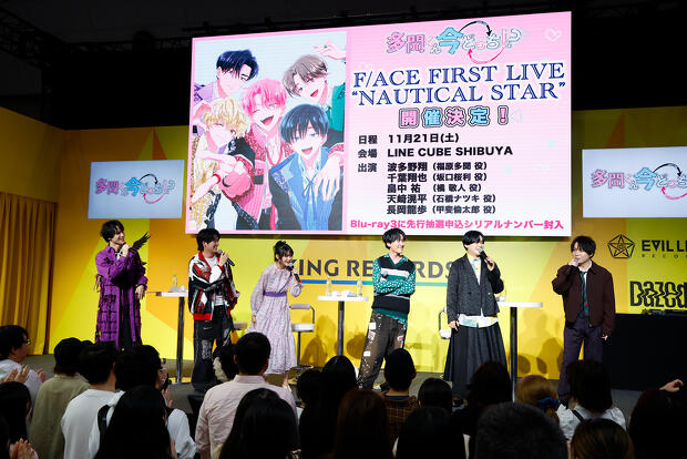 終盤には坂口桜利役・千葉翔也さんも駆けつけ、F/ACEの5人がそろったところでファンミーティングのお知らせが。2026年6月7日(日)に開催されるF/ACEを演じるキャストによる「『多聞くん今どっち!?』ファンミーティング♥感謝祭2026♥」だけでなく、10月17日(土)には早見沙織さん、原作者・師走ゆきさん、監督・永岡智佳さんによる「『多聞くん今どっち!?』ファンミーティング♥E/YESのつどい♥」が実現! さらに、うたげの誕生日でもある11月21日(土)には「F/ACE FIRST LIVE “NAUTICAL STAR”」と題し、東京・LINE CUBE SHIBUYAでファン待望の1stライブが開催されます。いずれも、Blu-rayに先行抽選申込のシリアルナンバーが封入されるとのこと。詳細は公式サイトをご確認ください!