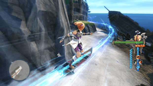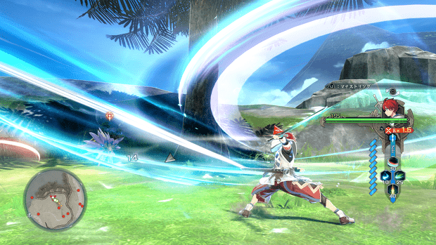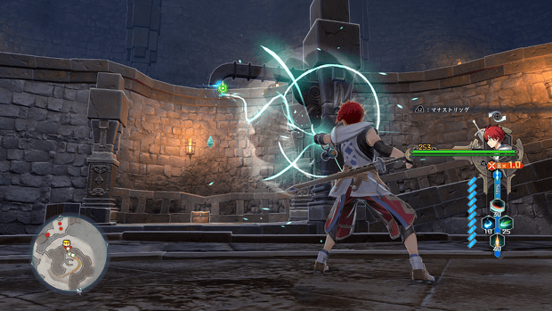 フィールドをしばらく進むと、空中に青い光が輝いている場所にたどり着きます。ここはマナアクションができる場所。アドルは古導具《ノルニルの糸車》を使うと、青い光にマナの紐を結びつけることができます。そして、その青い光を支点にして振り子のように自分の体をはじき飛ばし、遠くの場所へと移動できるのです(マナストリング)。また、青い光がライン状に光っているところでは古導具《グリンブルボード》を使うことで、スケートボードのように空中を青い光に沿って滑空することが可能(マナライド)。高速で空中を滑る《グリンブルボード》で小型の敵を蹴散らすといった痛快なプレイもできます。