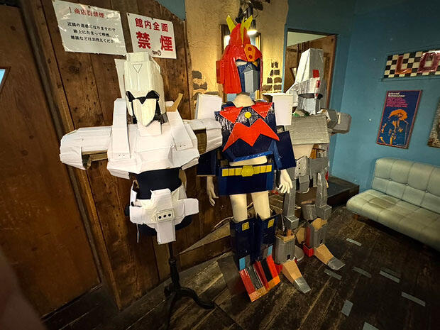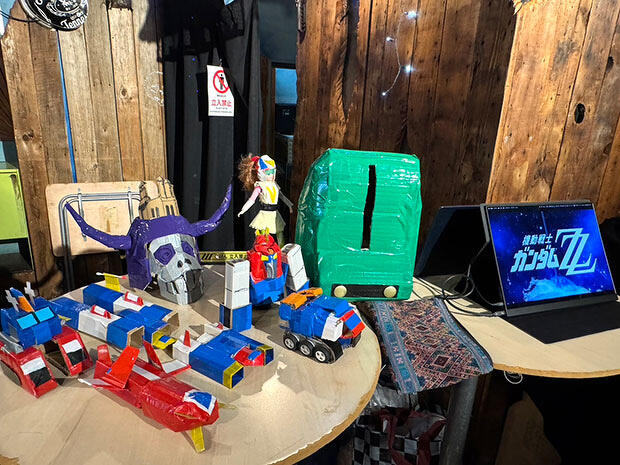 会場でまず来場者のみなさんを出迎えたのは、動画制作者・ツカーサさんによる「雑に実写再現」の撮影で実際に使用された衣装や小道具たち。そもそも「雑に実写再現」シリーズとは、YouTube「ツカーサさんの記録」チャンネルで公開されているファンムービーで、往年の名作ロボットアニメのオープニングなどをその名の通り、ダンボールで自作した衣装などを用いて再現している作品群です。