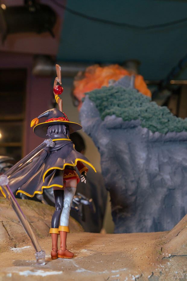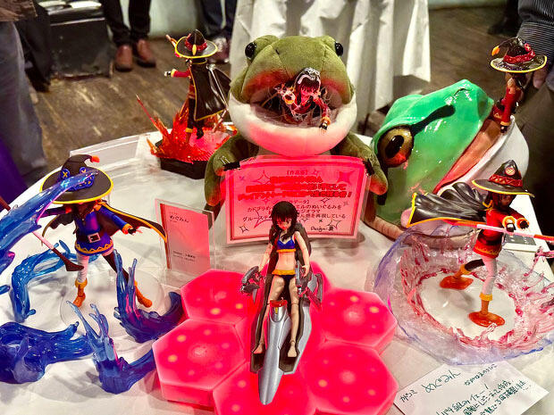 魔王軍幹部・ベルディアの城へ爆裂魔法を撃ち込みにいく日課のシーンを再現したジオラマをセンターに、アニメの原画用紙から飛び出してきためぐみん、ハロウィンカラーのめぐみん、ジャイアントトードに捕食されるめぐみん(!)などなど、それぞれの趣向を凝らした「めぐみん祭り」が開催されていました。