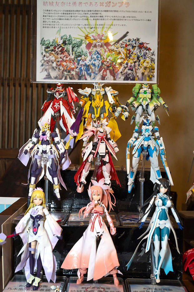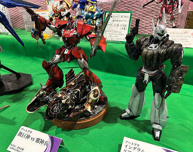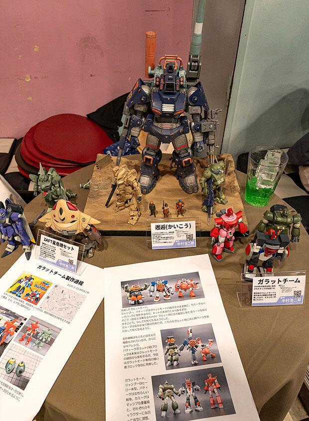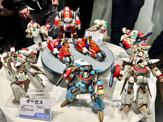他に目を引いた展示に、「超時空世紀オーガス」のキットを複数用いた変形の再現などといった企画展示などがされていました。これは昨年発売されたオーガスのキットを皆がほぼ同時に買うという楽しいシンクロニシティがあったから自然発生した展示なのだとのことです。