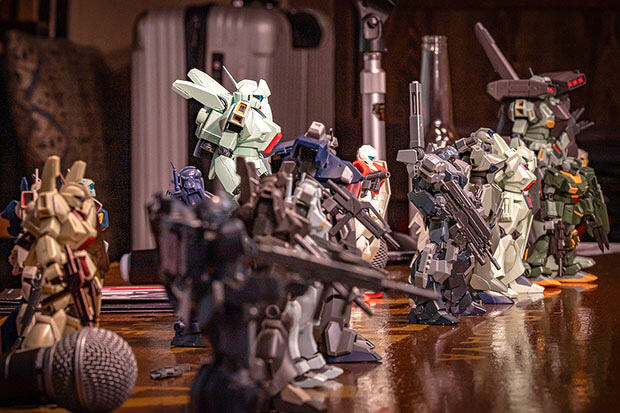 大須賀さんのプラモ人生に転機が訪れたのは小学校3年生のとき。「機動戦士ガンダム」シリーズに登場する「ジムコマンド」のキットを入手し、その出来の良さに驚いた大須賀さんは、そのままジムやジェガンといった量産機の虜にされたといいます。その直後、持ち込んだカバンから取り出したのは……なんと自宅に飾ってあったという量産機の数々!