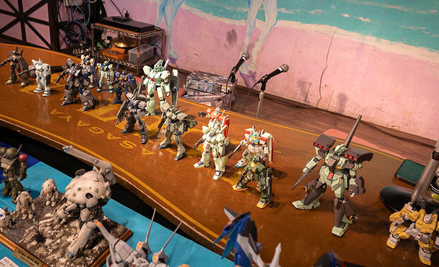 そんなノリと勢いで始めたわけですが、上江洲さんをはじめプラモ仲間のみなさんやゲストの志水アリカさんも連日お店に来てのエアブラシ塗装やジオラマ製作への初挑戦、参加メンバーのながはまのりひこさんからジオラマ素材をご提供いただいたり、心血注いだ作品が続々と完成していくオモシロ熱いドラマを日々堪能できるわけで。冥利に尽きる時間でした。ご覧いただいた皆様、作品にこもった熱意や思い入れが少しでも伝われば……もうみんな仲間です。