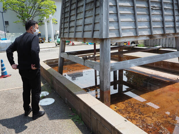 震災以降、供給が止まっている2号源泉を視察する橋本さん