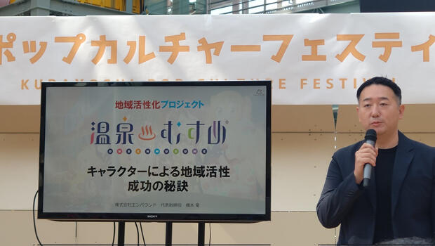 地方で講演をする株式会社エンバウンド代表取締役、「温泉むすめ」総合プロデューサーの橋本竜さん