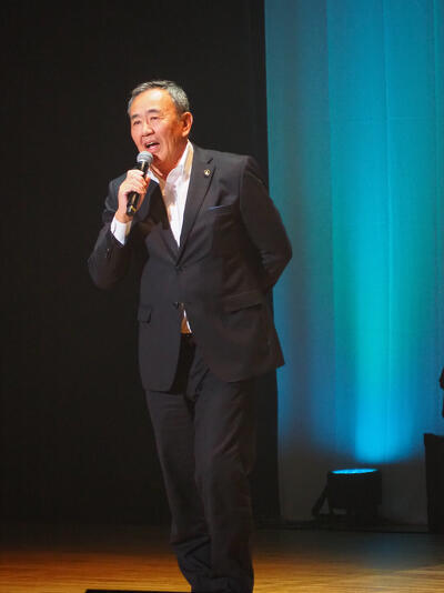 ライブコーナーとなる第2部の冒頭では、大垣市長・石田仁さんが当地の魅力を観客に訴えると、続いて声優の上間江望さんが登場。自身が作曲し、中村さんが作詞した「水の都・大垣アニメ文化祭」のテーマソング「その文化祭は終わらない」を歌唱し、早速会場を熱気に包みました。