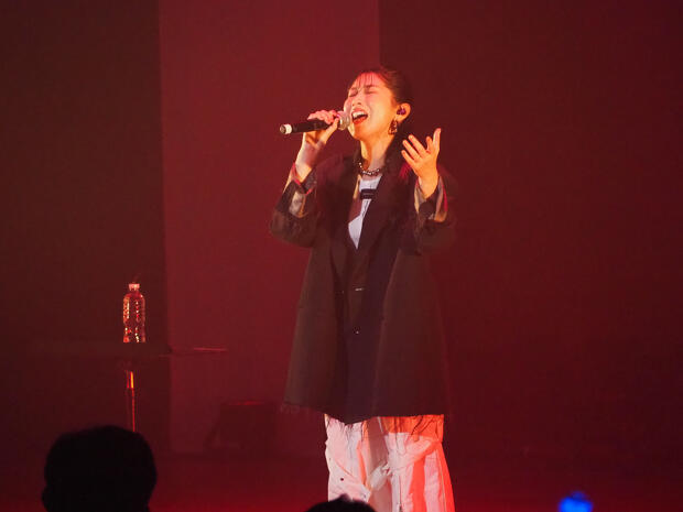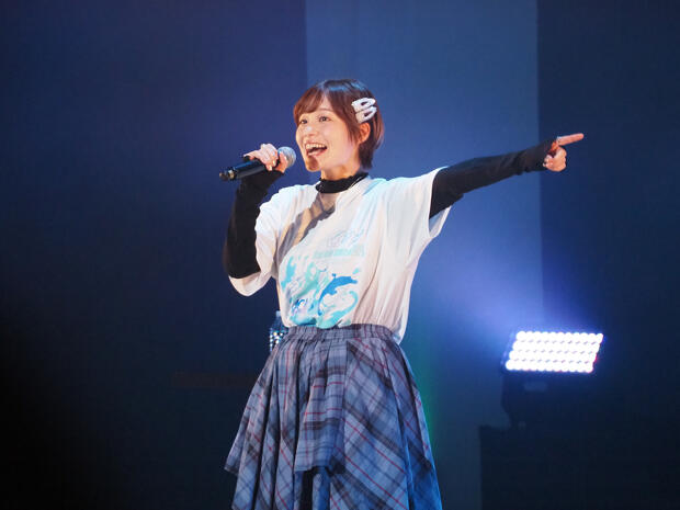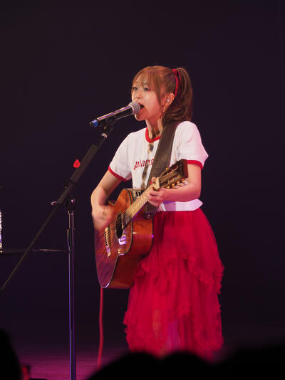 アコースティックギターをかついで現われた友希さんは、声優アイドルユニット・i☆Risで見せる姿とはまったく別の、シンガーソングライターとしてのパフォーマンスを見せます。特に思い入れたっぷりに歌ったのは「新幹線のなかで泣きながら、故郷で歌うために書いた曲です」という紹介から始まったバラードの「オレンジシャワー」。ほかにもバラエティ豊かな楽曲を披露し、故郷への凱旋を果たしました。