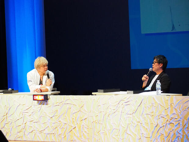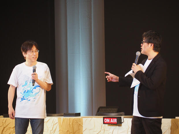 第1部では、MCの鷲崎健さんがゲストとトークを繰り広げるというコーナー。そのオープニングゲストとして、『BanG Dream!』や『D4DJ』といったコンテンツにストーリー原案や作詞で携わり、このイベントの発起人である中村航さんが登場しました。18歳まで大垣で過ごしたという中村さんは、青春時代や作家になるまでの紆余曲折を振り返りつつ、今回のイベントを企画した経緯を語ります。