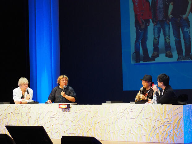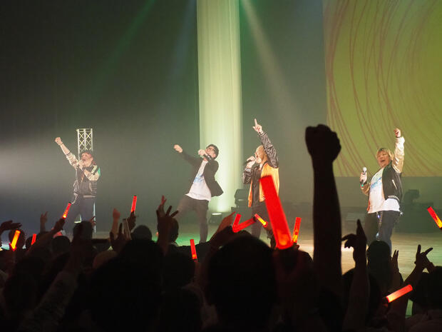 最後のトークゲストは遠藤正明さん。「正明」という名前は自宅の3軒隣のおじさんが名付けたというリラックスしたトークが繰り広げられるなか、bambooさんとやまけんさんが加わり、MCの鷲崎さんも含めて遠藤会が集結。このユニットは遠藤さんを中心にした飲みサークルだそうですが、コロナ禍のためしばらく飲むことができず、今回が6年ぶりの活動とのこと。気心が知れたメンバーということで、唯一のアニメタイアップ曲となる「健全ロボ ダイミダラー」が作られた経緯や、イベントまでに水まんじゅうや岐阜タンメン、ソースカツ丼など岐阜の食を存分に楽しんだことが賑やかに伝えられました。