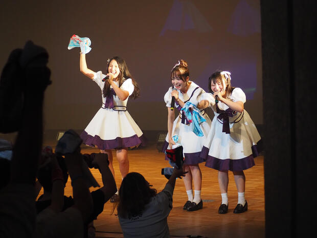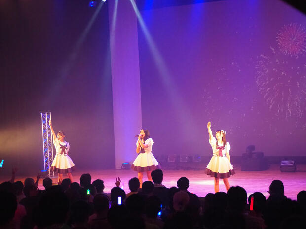 「温泉むすめ」は盛り上がり必至の人気曲「咲かせよ 沸かせよ バンバンBURN!」でスタート。福地珊瑚のキャラクターソング「気分はストレンジャー」を反田さんと三谷さんの2人で歌ったり、初期から歌われるバラード「さよなら花火」を、長良川と花火大会をイメージして中村さんが歌詞をアレンジした「長良の花火」といった今回限りの特別なステージで存在感を発揮。終盤には「Petit Etoile」「青春サイダー」といったアッパーナンバーを続け、会場を熱気に包みます。