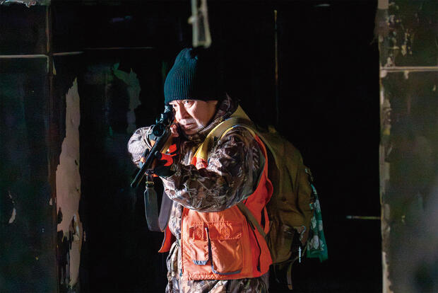 そして、この事件をヒントに生まれたのが、映画「ヒグマ!!」である。本作に登場するエゾヒグマの〝19〟は、VFXも併用しつつ、8割近くの登場シーンが造形物で表現されており、撮影の目的に合わせてひとりの演者による二足歩行スタイルと、獅子舞のように2人の演者が入る四足歩行スタイルの着ぐるみが使い分けられた。「ウルトラマンブレーザー」や「仮面ライダーゼッツ」の怪獣・怪人デザインで広く名が知られるようになった百武朋がデザインの方向性を打ち出していることもあり、非常にモンスターナイズされたルックスに仕上がっている点にも注目されたし。また、そんなバケモノに立ち向かうはめに陥る主人公を、いまだ〝福くん〟のイメージが残るベビーフェイスの鈴木福が演じている点もおもしろい。闇バイトがきっかけゆえに自業自得ながら、どこか同情を誘い、かわいそうにも見えすぎない絶妙なキャスティングではないか。〝闇バイトとヒグマの死闘〟という一見すると出落ちのような舞台設定だが、最後まで飽きさせない工夫が凝らされた一本だ。