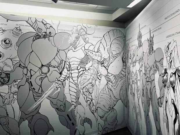 まず会場入口では、ガイバーや獣化兵(ゾアノイド)たちがプリントされた等身大ウォールが出迎えてくれる。「『仮面ライダー』みたいなまんが描いて」という身もふたもない編集部オーダーで始まった作品だけあって、コミックスの巻末には「設定資料室」と冠された“怪人図鑑”が載っており、各キャラクターの詳細なスペックが明らかにされているのだが、体高240cmってこんなに大きいものなんですね……などと圧倒されること請け合いだ。