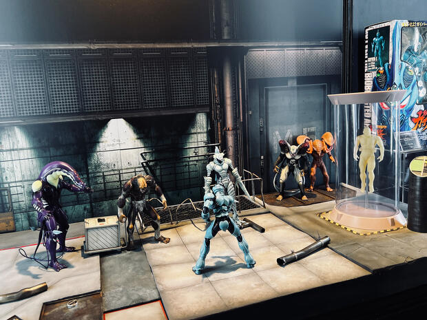 会場には現行アイテムであるfigmaはもちろん、今となっては入手困難となってしまったバイオ・ファイター・ウォーズならびにバイオ・ファイター・コレクションMAX、それらの前身ともいえるソフビキットのバイオ・ファイター・コレクションなども展示されており、未発売に終わったグレゴールの試作品やキャンペーンの景品だった調整槽とDr.バルカスまで間近に見ることができる。