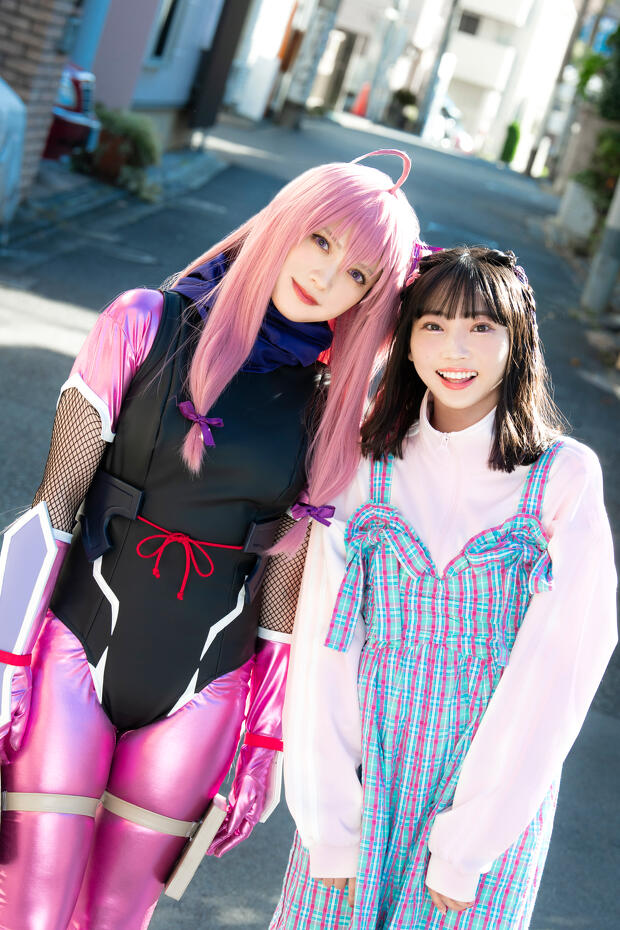(左から)しづりの声優を務める矢野妃菜喜さんと、しづりのコスチュームに身を包むコスプレイヤーの桃月なしこさん