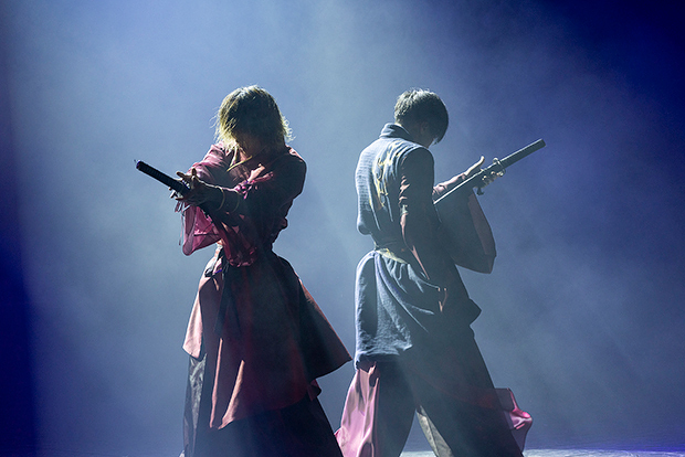 第二部はお芝居。初日の演目は、早乙女さんがゲスト出演もしている『劇団☆新感線』の座付き作家にして、劇場アニメーション『プロメア』(早乙女さんもリオ・フォーティア役として参加)の脚本も手がけた、中島かずきさんの新作「桜吹雪八百八町」です。タイトルからわかるように題材となったのはご存知、遠山の金さん。市井の人々の暮らしを知るため遊び人に扮する金さんを演じる早乙女太一さん。一方で、江戸の町いちばんに咲き誇る一本桜の精に扮するのは弟の、早乙女友貴さん。兄弟2人が愉快な掛け合いを繰り広げます。