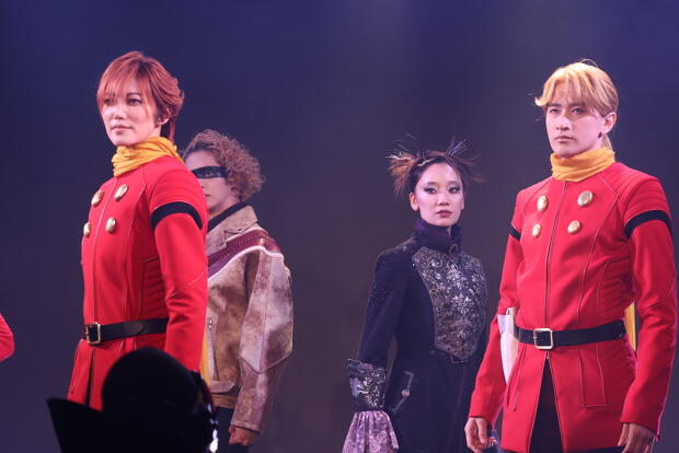 そこへ、まぶしい光を放って登場する009/島村ジョー(七海ひろき)! おなじみの赤いスーツに黄色のスカーフをたなびかせたサイボーグ戦士たちが続々と駆けつけ、人質を救い出すとともに、それぞれの特殊能力で敵を制していくアクロバティックな戦い、そしてヒップホップな舞台版のメインテーマを歌い踊る姿は公演の前哨戦とでもいうべき迫力で劇場を沸き立たせました。