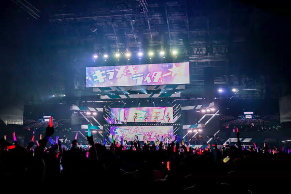 遂に「声出し解禁」となった全体フェス「hololive 4th fes. Our Bright Parade Supported By Bushiroad」。興奮を抑えられない会場一体となったカウントダウンでスタートした開幕1曲目はDAY1出演メンバー全員による「キラメキライダー☆」。1stフェス「ノンストップ・ストーリー」で披露された全体曲だが、コロナ禍の下で大きく躍進したホロライブのステージで、どれだけ多くのファンがこの曲で思い切り声を出してコールしたいと願っていたことだろう。