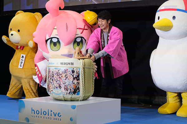 壇上に着ぐるみたちも集合してファンを喜ばせる中、最高潮に盛り上がったのはホロライブを運営するカバー株式会社CEOの谷郷元昭氏が登壇した瞬間。ピンクの法被姿でステージ袖から現れたホロライブのベストアイドル“YAGOO”にファンのボルテージは一気に最高潮となり、大きな歓声があがります。すべてのファンとスタッフへの謝辞をとともにEXPOとフェスの開催を宣言すると、2日間にわたるイベントの成功を祈念してYAGOOとホロメンによる鏡開きが行なわれました。