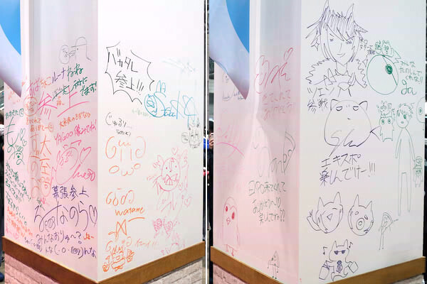 レッドカーペットの両脇に立つ6本の柱にはホロライブ&ホロスターズのメンバーによる直筆メッセージ。ホロメンがここに来たんだ!という感じがする嬉しいサプライズ