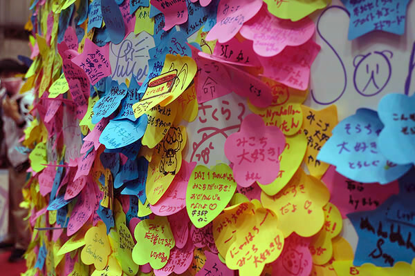あんきもオブジェのケーキ型台座には、来場したファンが付箋でメッセージを貼れるようになっていて、推しの書いたサインの周りにファンの熱いメッセージが。とどけこの想い!