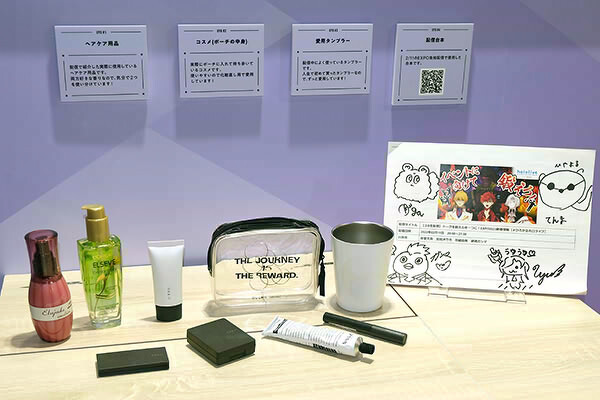 「ACT」の壁に展示されていた、羽継烏有のコスメグッズと配信台本