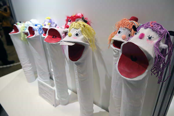 小鳥遊キアラ作のソックスパペット。何とも形容しがたいENメンバーのパペットはオフコラボ配信でも使われている。海外勢の展示はJPメンバーとはまた異なるセンスを感じさせる