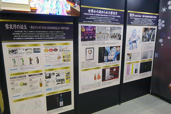 「明利酒類株式会社」のブースではオープニングセレモニーで使用した酒樽の他、IWCC2022でブロンズメダルを獲得した雪花ラミィとのコラボ日本酒「雪夜月」についてのパネル展示を行なっていた